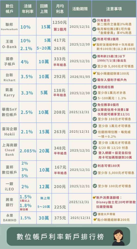 攻略⇥【2025更新】數位帳戶活存利率新舊戶排名前11家銀行&推薦碼